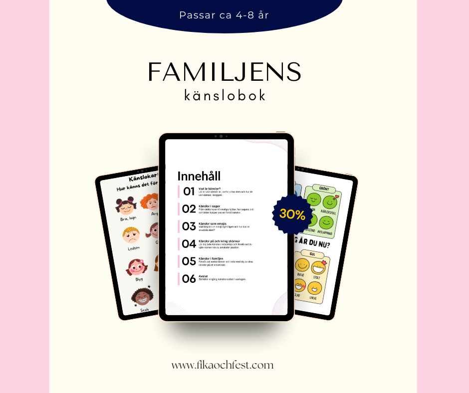 Familjens känslobok passar familjer med barn ca 4-8 år. Den är full av pedagogiska övningar för att träna på känslor tillsammans. Att förstå vad som händer i kroppen är väldigt värdefullt för både vuxna och barn! Du hittar den här!