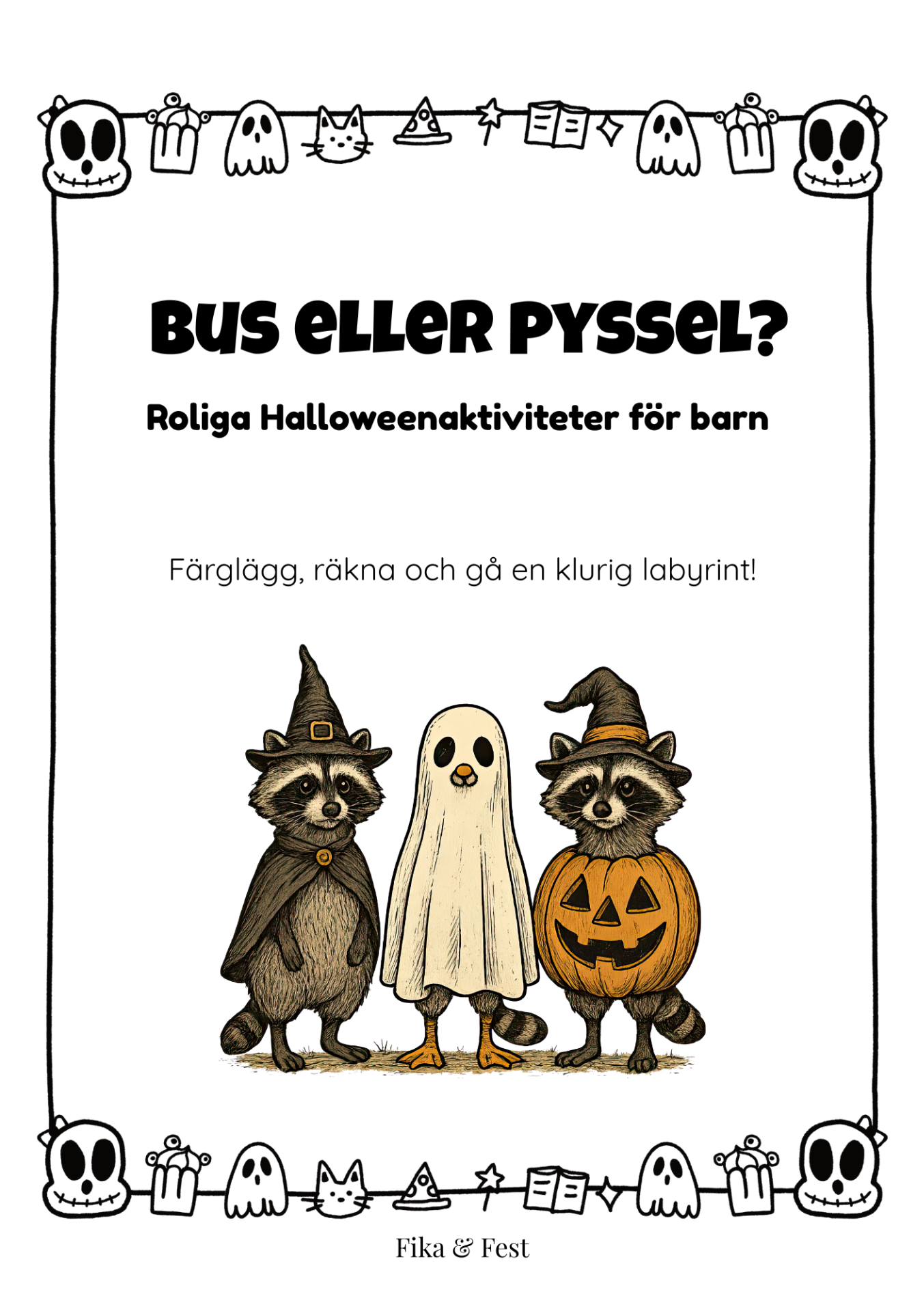 Fika & Fest bjuder på en rolig Halloweenpresent: ett gratis nerladdningsbart pysselhäfte för barn ca 5–9 år. Här kan ni färglägga och lösa små uppgifter fyllda med bus och fantasi, perfekt för en mysig stund tillsammans! På några av sidorna behöver man kunna lite bokstäver. Hoppas ni får en fin pysselstund! Eller blir det bus? 😁